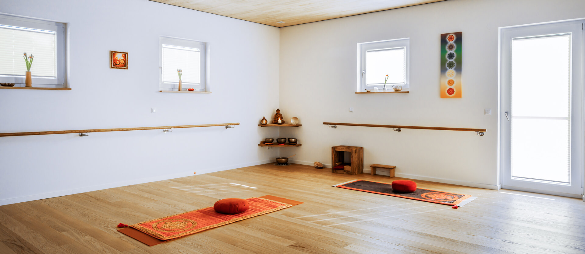 Der Übungsraum bietet eine wunderbare Atmosphäre, in dem alle Übungsmaterialien (Matten, Decken, Kissen ….) vorhanden sind; gerne kann eigenes Material benutzt werden.